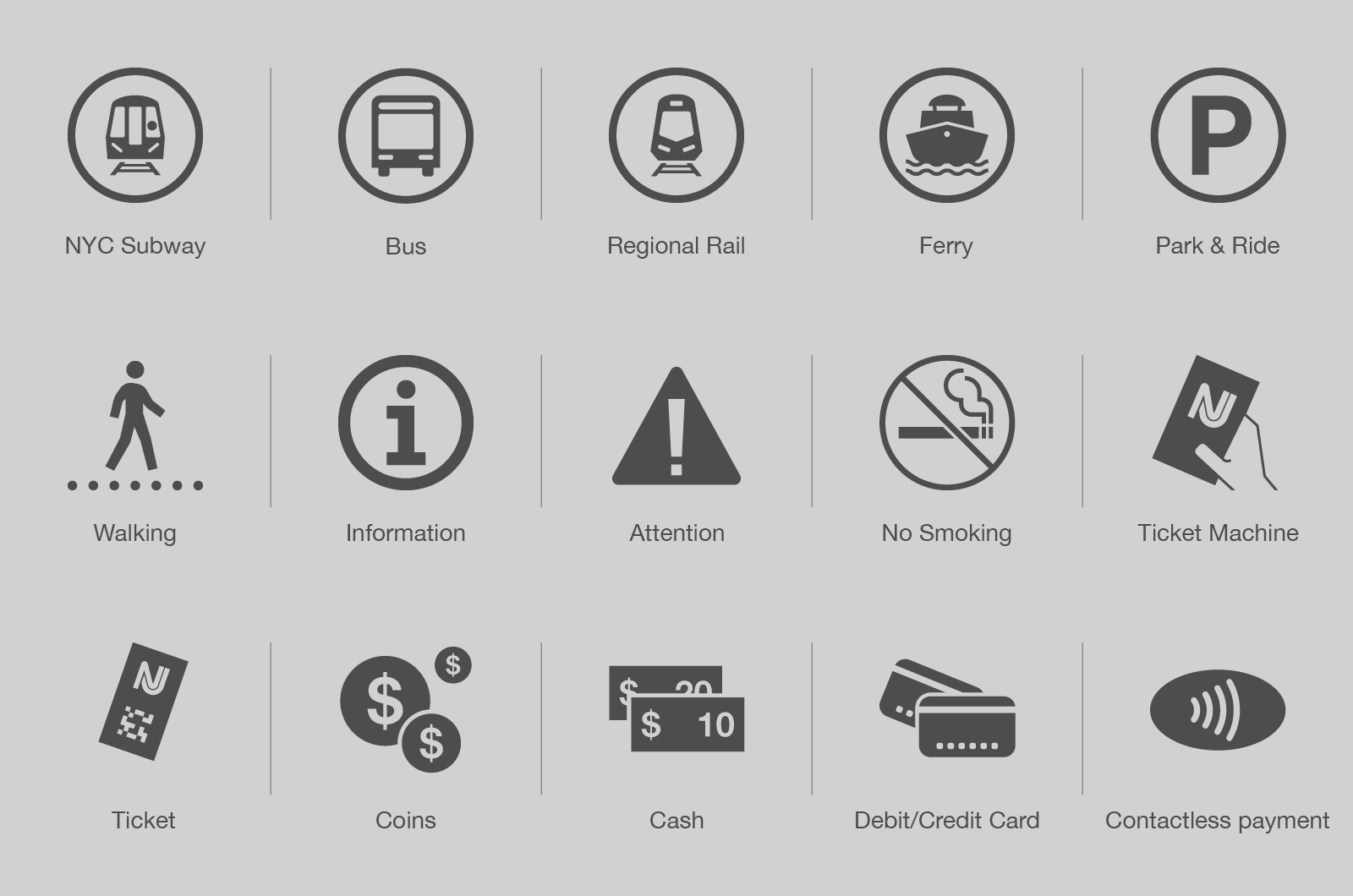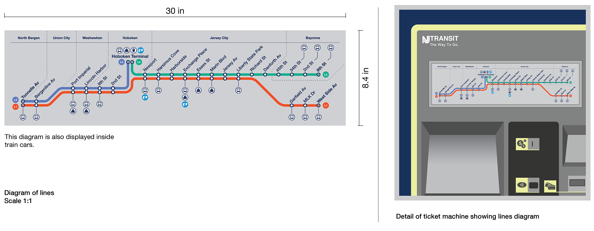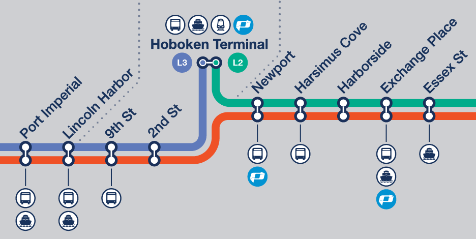 A cleaner, more intuitive map that display the same graphic elements of the signage. It functions more like a diagram since it is not completely geographically accurate (although it displays some landmarks). Passengers can now quickly orient themselves since every transportation mode has its own color and symbols and easily identify connections to PATH, NJ Transit, NYC Subway, and ferry services.