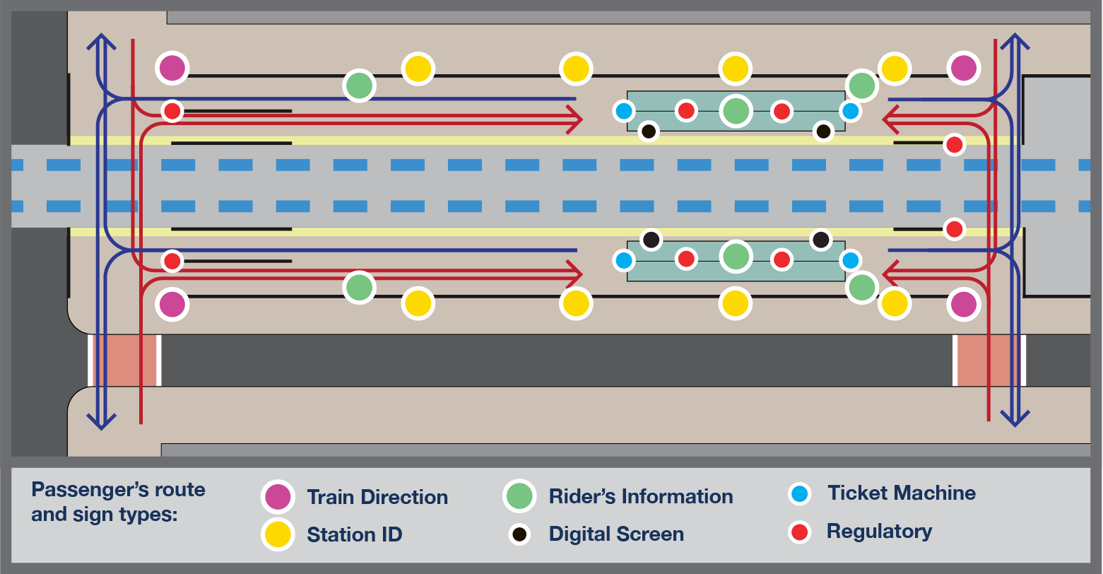 Sign placement was driven by decision-point analysis along the passenger journey. Every sign responds to a specific navigational need, with different types of signage: identification, information or reassurance. Full ADA compliance and universal design principles ensure the system serves every user equitably.